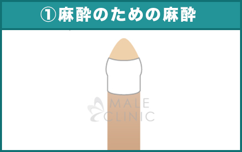亀頭下に極細0.05mmの注射針で麻酔を注入します。(5秒程度)麻酔テープの効果でほとんど痛みを感じません。念のため、5~10分休憩して更に麻酔を効かせます。